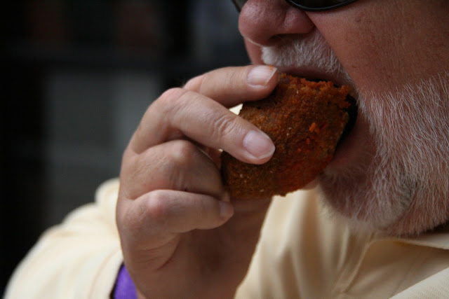 And where the day would typically end for the yearly cigar-festival attendee, we still had one more stop to make. We made our way over the trolley tracks, rumbling down 7th street while carefully assessing each curb cut on the way, seemingly more like launch pads than ramps, until we came upon it – King Corona. We settled on a little table off the to the side and as we savored our coffees laced with caramel and cayenne pepper, puffing away our cigars (mine, a cigarillo), we delightfully watched as the colorful people of Ybor City marched by.